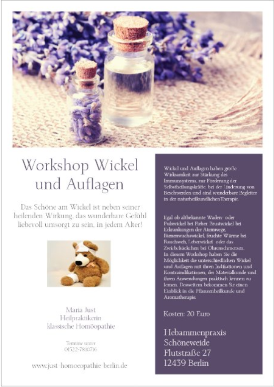 In regelmäßigen Abständen biete ich Vorträge zu verschiedenen Gesundheitsthemen an und veranstalte Workshops für "Wickel und Auflagen, eine natürliche Hausapotheke" und "Homöopathie für die ganze Familie".