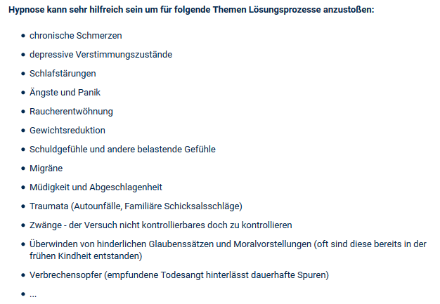 Meine Schwerpunkte liegen im Bereich Stressreduktion, Traumatherapie, Hypnose, chronische Schmerzen und Akupunktur.
